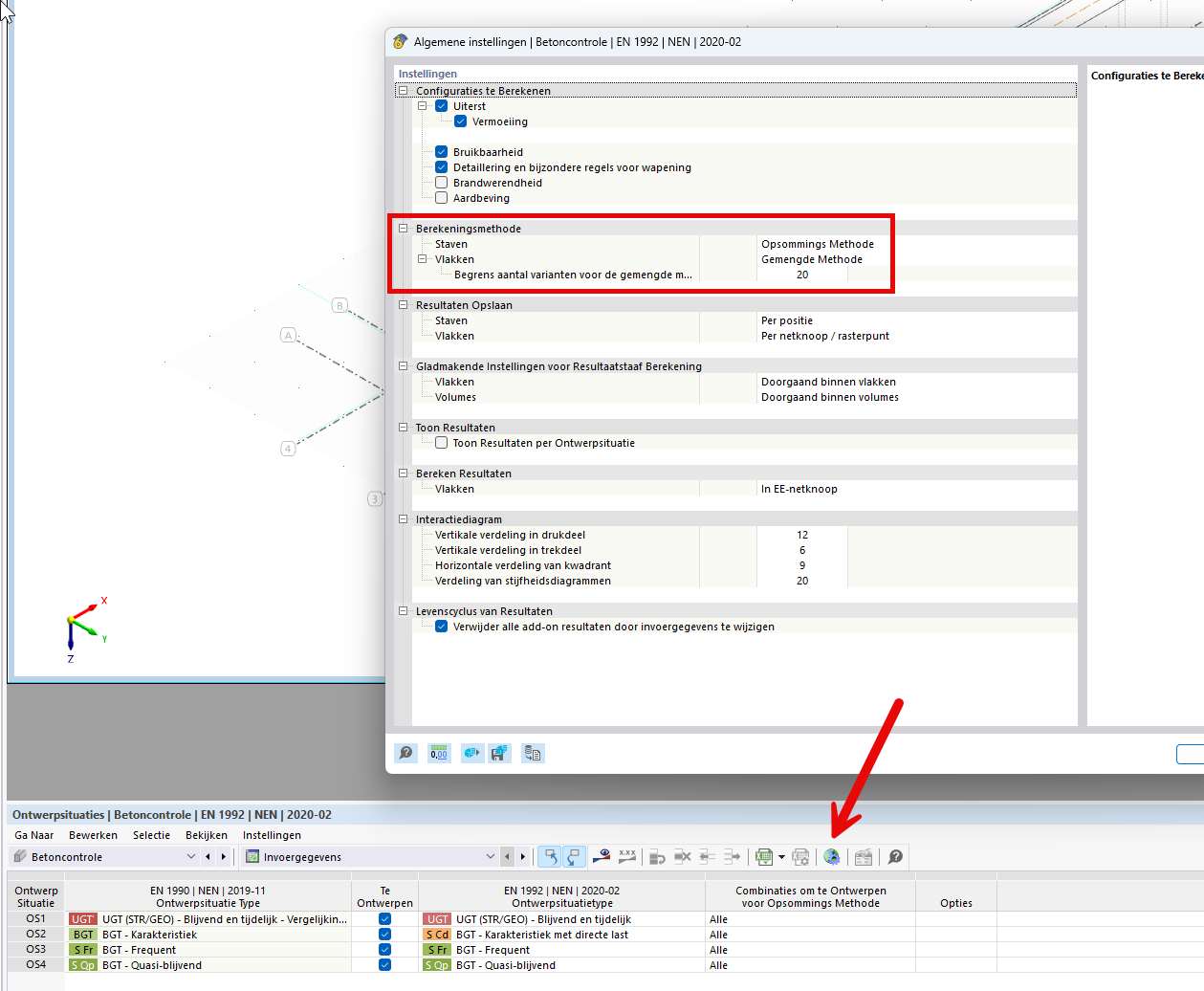 - Gemengde Methode: Beide hierboven beschreven methoden worden hier gecombineerd. Er is de optie om "aantal varianten" aan te passen als een grenswaarde, waarbij je kunt schakelen tussen de Opsommings Methode en de Omhullende Methode. Met de standaardwaarde van 20 gebruikt het programma de Opsommingsmethode zolang het aantal "resultaatvarianten" minder dan 20 is. Indien het aantal varianten in een ontwerpsituatie groter dan of gelijk aan 20 is, wordt de Omhulllende Methode gebruikt om berekeningstijd te besparen. U kunt de instellingen afzonderlijk maken voor staven en vlakken.