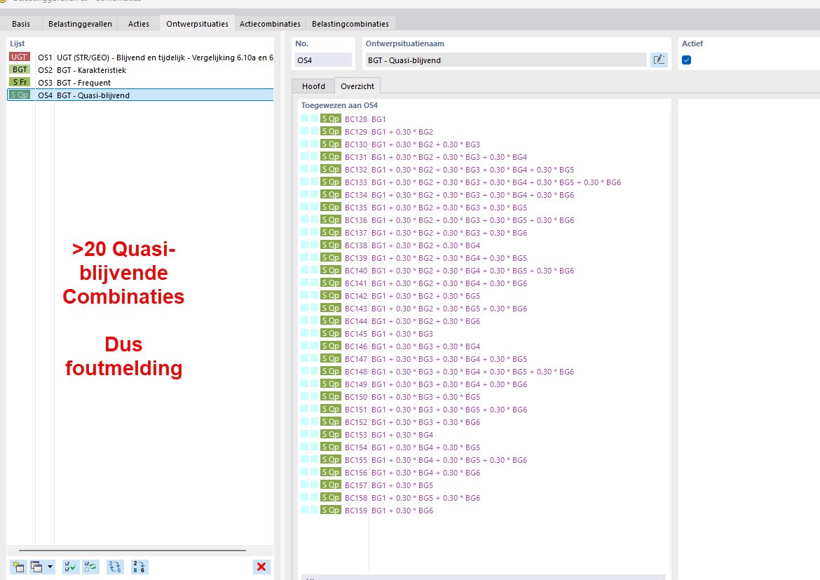 Omdat er voor de berekening van de doorbuigingen altijd met de Opsommingsmethode gebruikt. Om deze reden kunt u een foutmelding als het aantal belastingcombinaties of lineaire resultaatcombinaties voor de BGT quasi-blijvende ontwerpsituatie groter is dan 20.