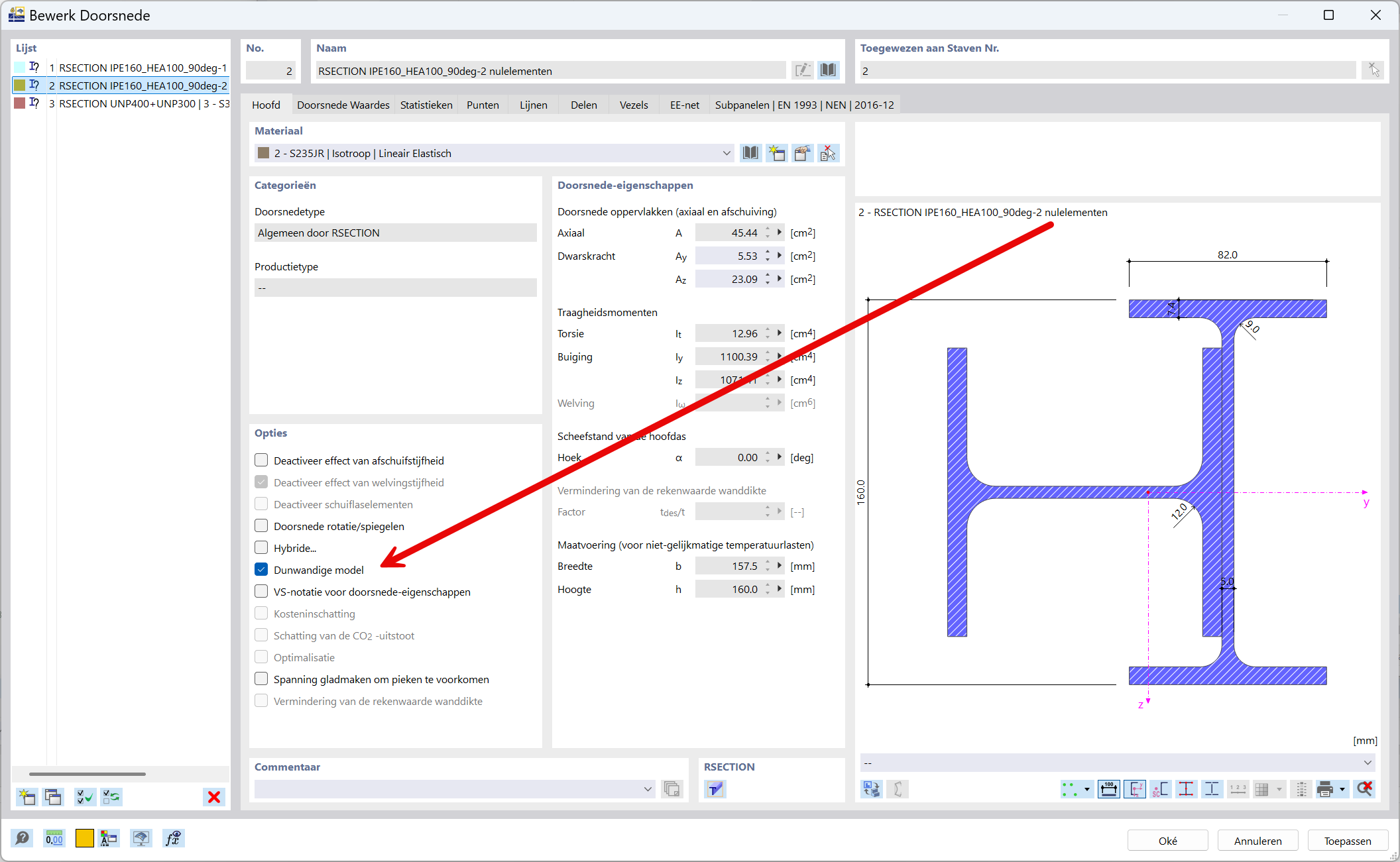 In RFEM 6 zou het volgende gebeuren, zie bijlage, als u bijvoorbeeld slechts één nul-element zou toepassen op positie (2). Zie staaf 1 van het RFEM 6 model. Het profiel wordt niet als zodanig 'dunwandig' herkend. Dit komt omdat de elementen van beide profielen geen gemeenschappelijk punt hebben. Zie ook: https://www.dlubal.com/en/support-and-learning/support/faq/005391.